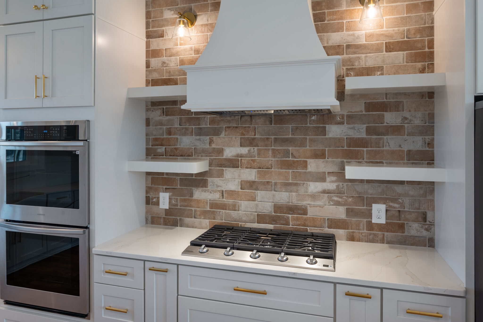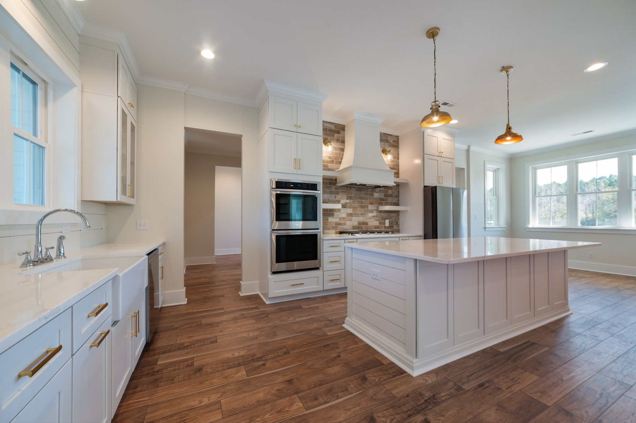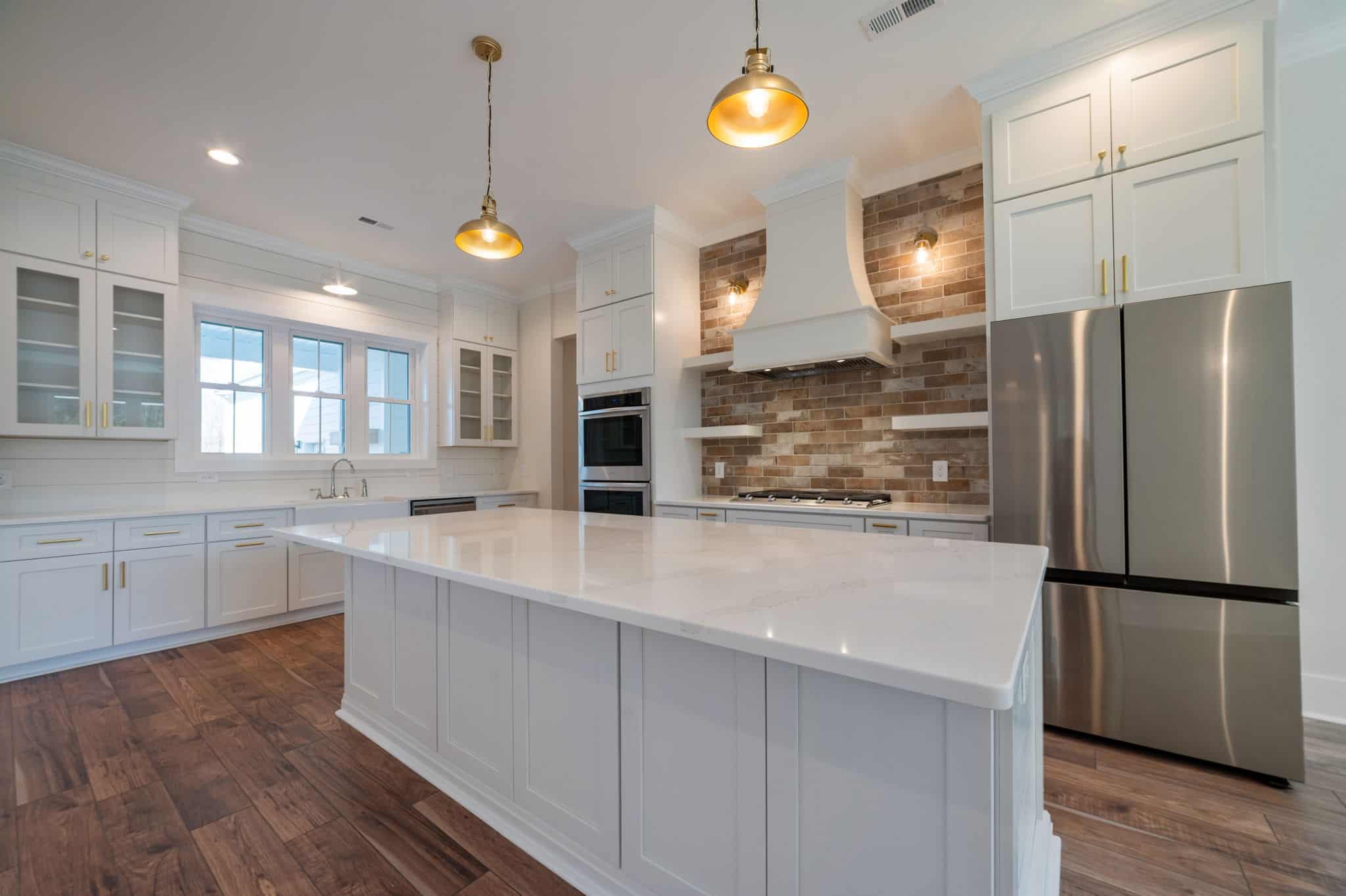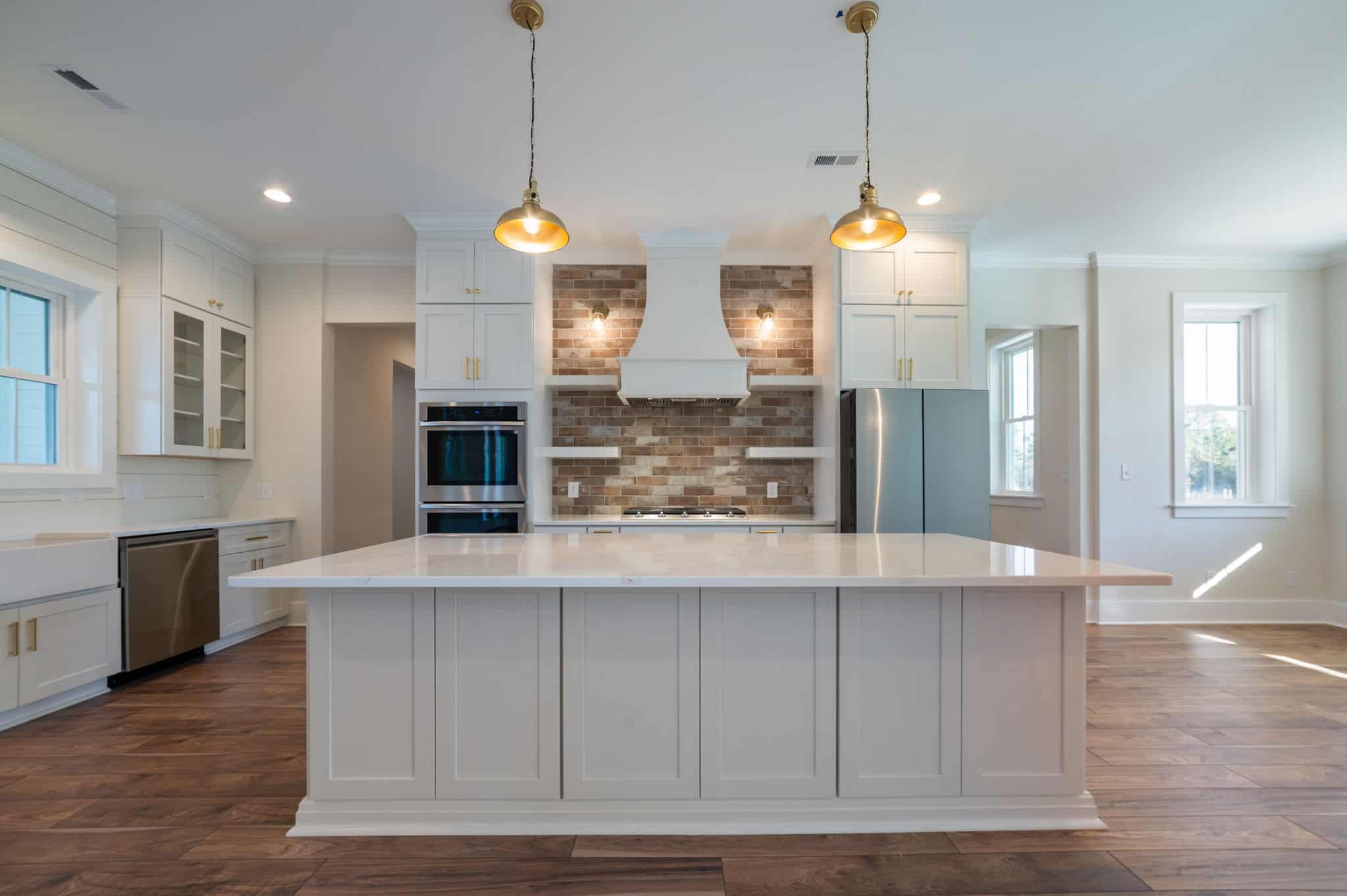 This farmhouse-inspired home immediately feels welcoming, grounded, and beautifully crafted. Its charming style is carried through every room, starting with the brick fireplace that anchors the living area. The moment you step inside, it draws you in with warm, textural character. That same brick detailing carries seamlessly into the kitchen, where the backsplash above the stove adds a cozy, artisanal touch that ties the heart of the home together.