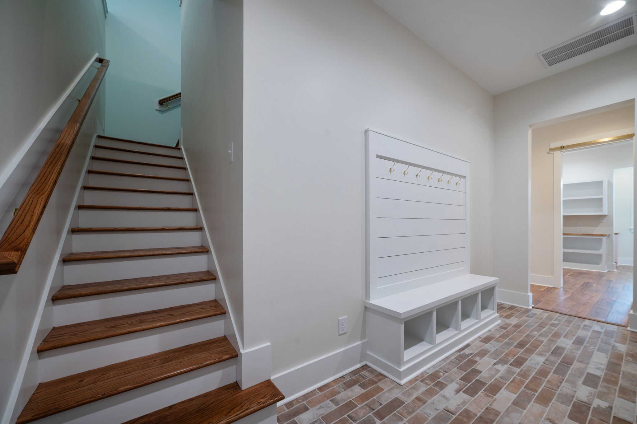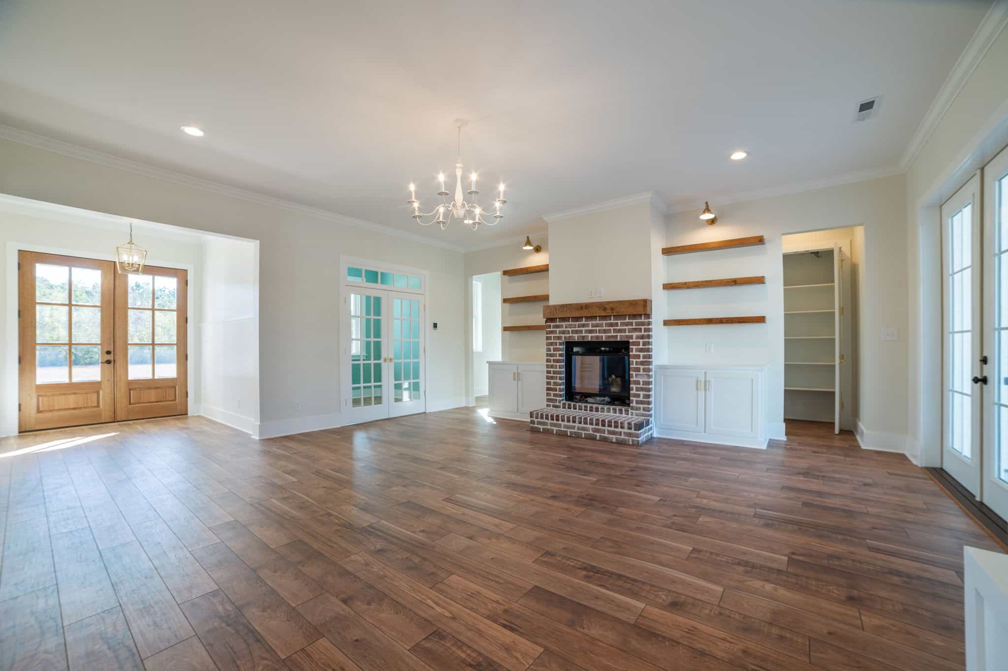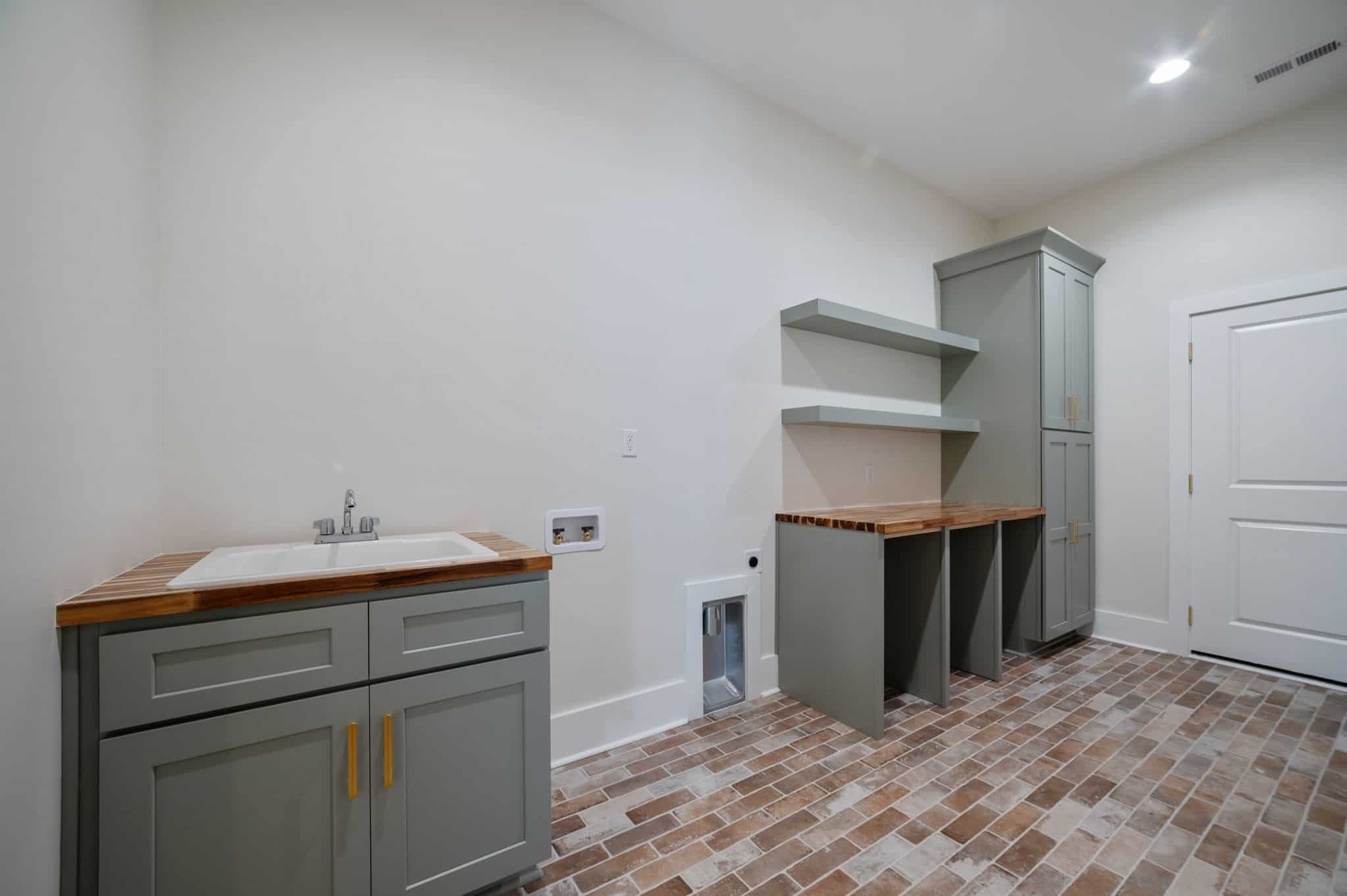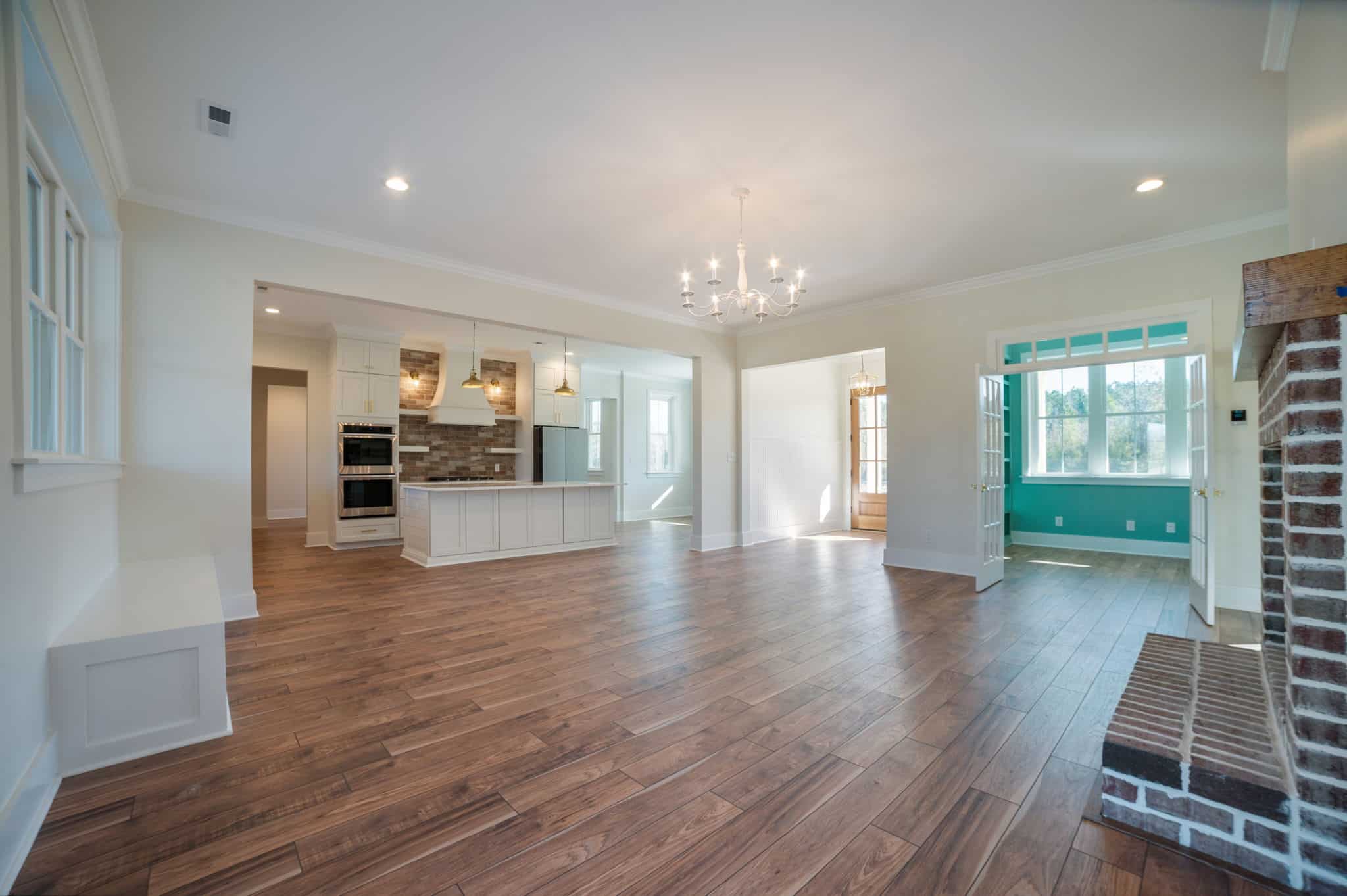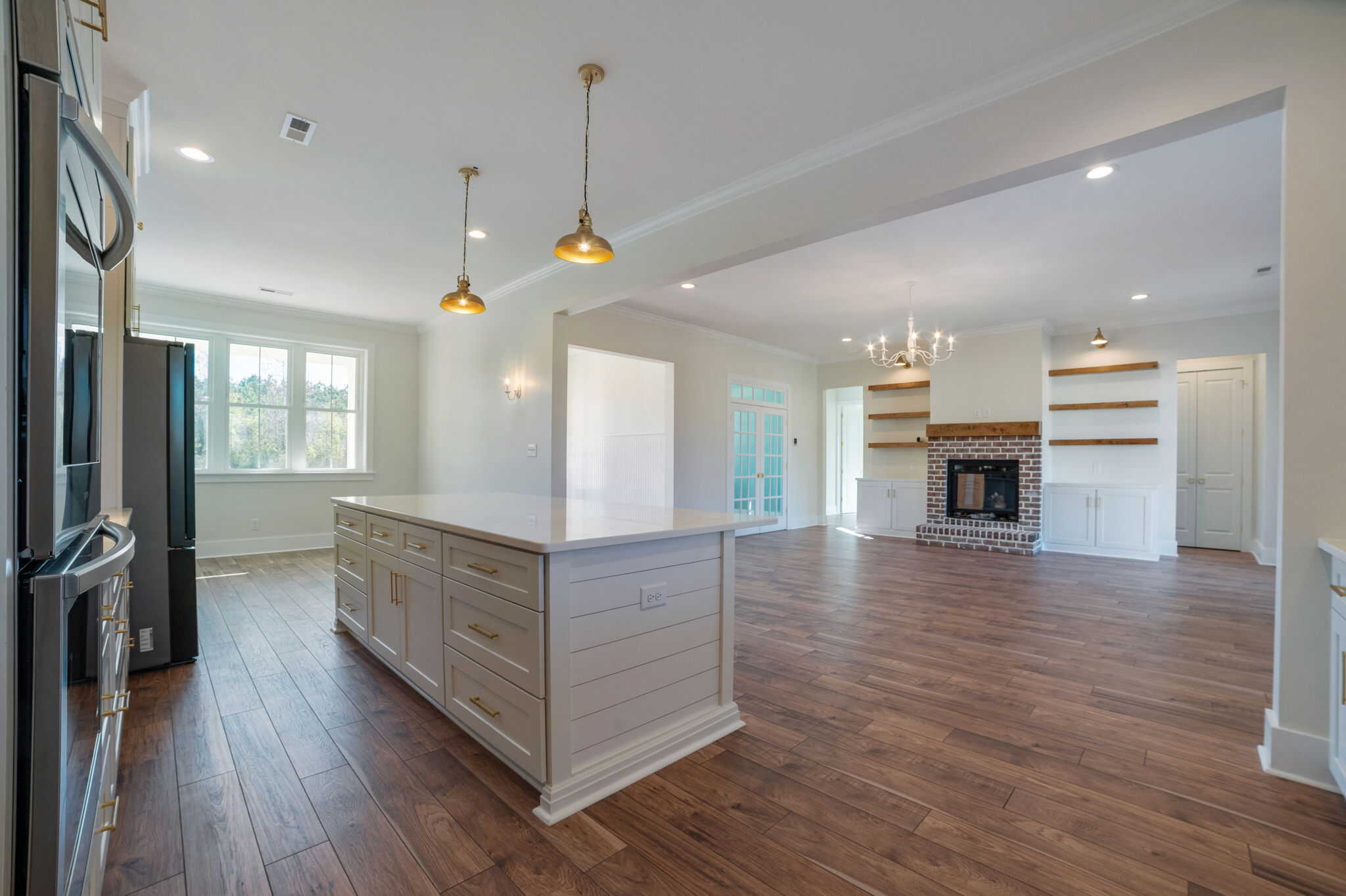 This farmhouse-inspired home immediately feels welcoming, grounded, and beautifully crafted. Its charming style is carried through every room, starting with the brick fireplace that anchors the living area. The moment you step inside, it draws you in with warm, textural character. That same brick detailing carries seamlessly into the kitchen, where the backsplash above the stove adds a cozy, artisanal touch that ties the heart of the home together.